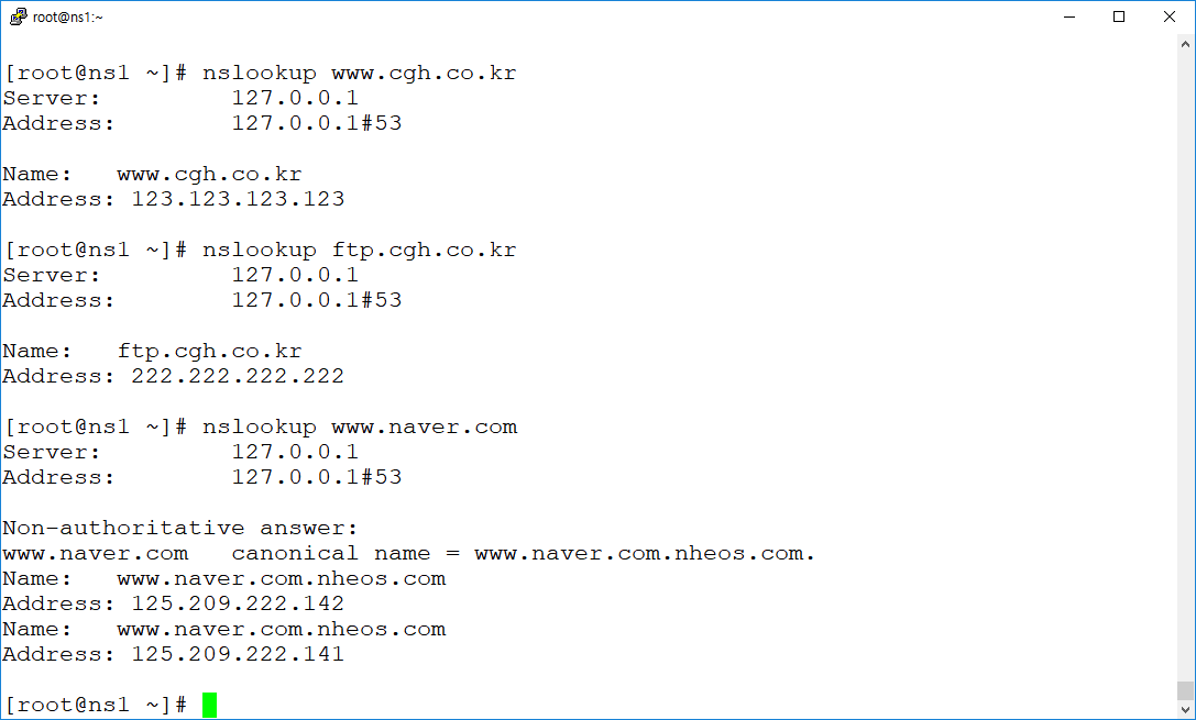 이 처럼 캐시 DNS 서비스와 임의로 만든 ZONE 파일이 잘 작동되는 것을 확인할 수 있었다.